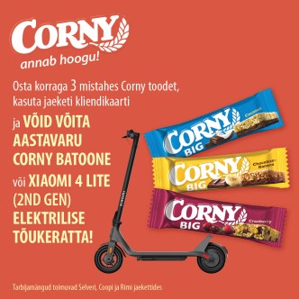 Perioodil 25.08.-29.09.2025 toimub CORNY tarbijamäng Selveri kauplustes, kus loositakse välja 1x Aastavaru Corny batoone (365 batooni), 1x Xiaomi Scooter 4 Lite (2nd Gen) elektritõukeratas, 5x 50 EUR Partnerkinkekaarti.